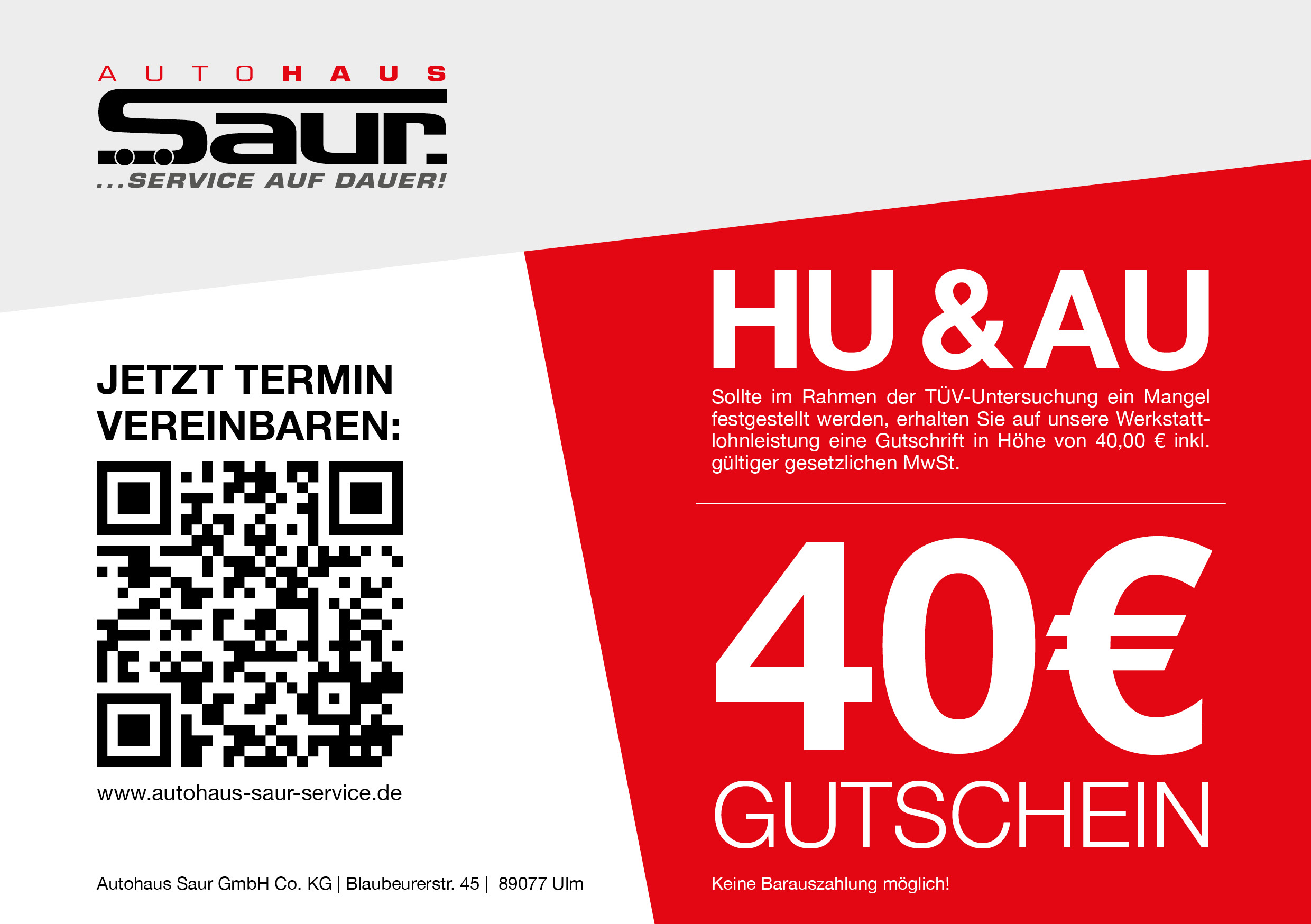 2) Sollte im Rahmen der TÜV-Untersuchung ein Mangel festgestellt werden, erhalten Sie auf unsere Werkstattlohnleistung eine Gutschrift in Höhe von 40,00 € inkl. gültiger gesetzlicher MwSt.
